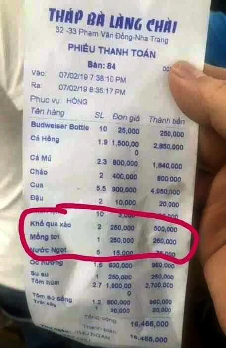 Tờ hóa đơn này ghi ngày 7-2, tức mùng Ba Tết Nguyên đán Kỷ Hợi. Phiếu thanh toán thể hiện khách phải trả gần 16,5 triệu đồng sau khi ăn 14 món, uống 10 chai bia. Trong đó, có một số món ăn có giá bán rất cao như khổ qua xào có 250.000 đồng/đĩa, mồng tơi 250.000 đồng/đĩa, su su 250.000 đồng/đĩa, cháo 400.000 đồng/phần… Kết quả kiểm tra của Đội Quản lý thị trường số 1 Nha Trang xác định trong thực đơn của nhà hàng Tháp Bà Làng Chài không có một số món thể hiện trong phiếu thanh toán tính tiền đối với khách như mồng tơi, khổ qua xào…