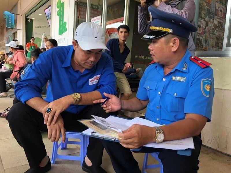 Thanh tra đang làm việc với tài xế. Ảnh: ĐÀO TRANG