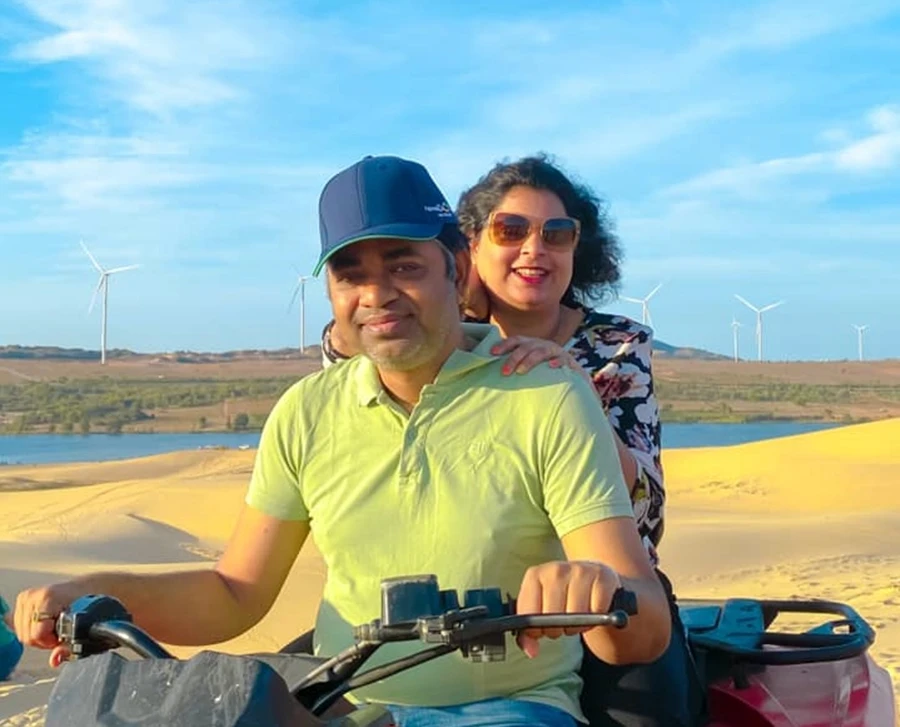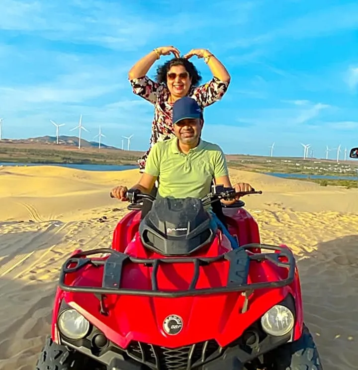 Vợ chồng ông Madan Mohan Sethi thích thú trải nghiệm đồi cát trên xe địa hình. Ảnh NQ.
