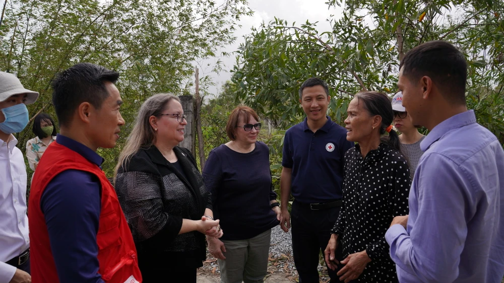 Tổng Lãnh sự Damour và Giám đốc USAID Việt Nam Ann Marie Yastishock thăm gia đình người dân Quảng Nam bị ảnh hưởng bởi bão lũ. Ảnh: USAID/Vietnam