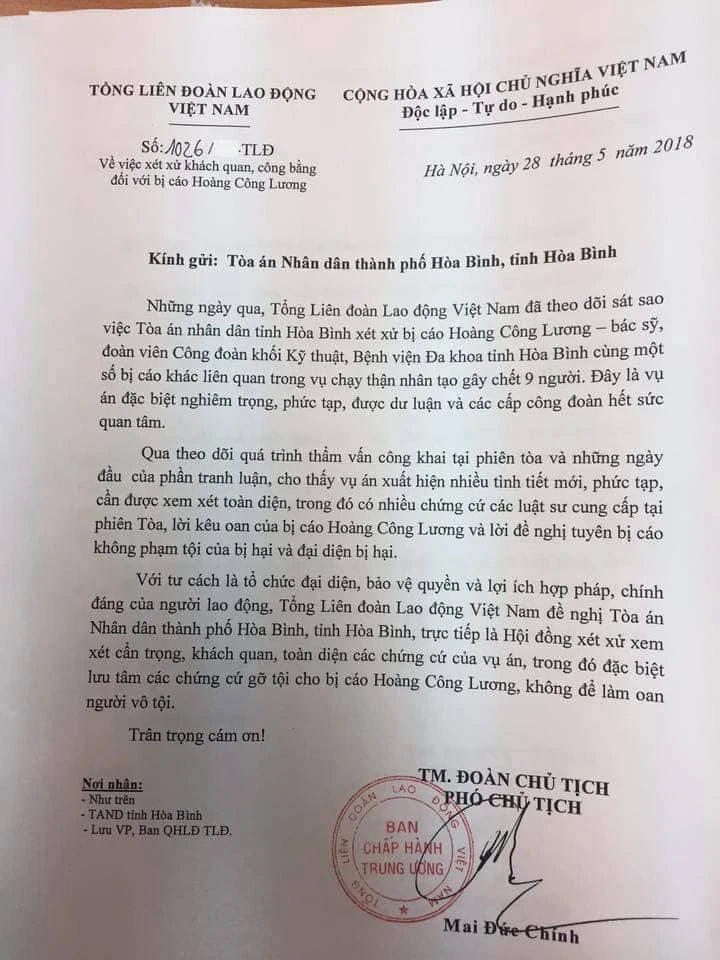 Công văn gửi TAND TP. Hòa Bình của Tổng liên đoàn lao động Việt Nam có nêu: “Những ngày qua, Tổng liên đoàn lao động Việt Nam đã theo dõi sát sao việc TAND tỉnh Hòa Bình xét xử bị cáo Hoàng Công Lương – bác sỹ, đoàn viên Công đoàn khối kỹ thuật, bệnh viện đa khoa tỉnh Hòa Bình cùng một số bị cáo khác liên quan trong vụ chạy thận nhân tạo gây chết 9 người. Đây là vụ án đặc biệt nghiêm trọng, phức tạp, được dư luận quan tâm.