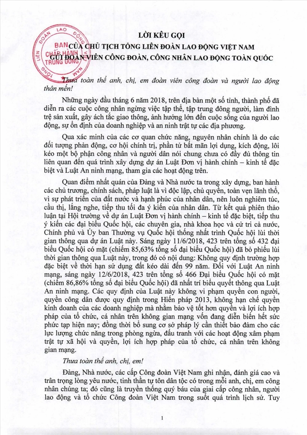 Tổng Liên đoàn Lao động Việt Nam kêu gọi đoàn viên, công nhân lao động trên toàn quốc thật sự tỉnh táo, không nghe lời xúi dục của kẻ xấu, chấm dứt hành vi tụ tập đông người…