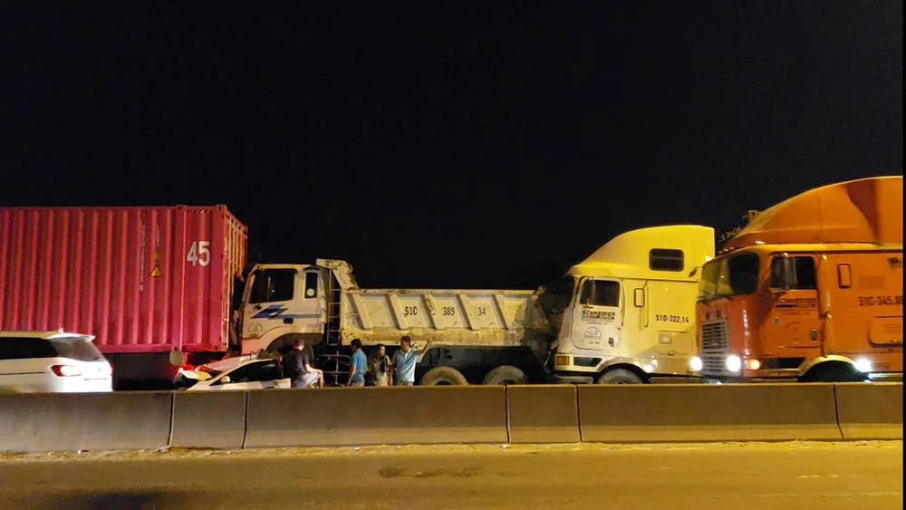 Tối 20-12, dòng xe đang lưu thông qua cầu Phú Mỹ, hướng từ quận 7 sang quận 2. Lúc này, một xe container và ô tô bốn chỗ giảm tốc độ rồi dừng hẳn trên dốc cầu Phú Mỹ do ảnh hưởng của điểm ùn ứ phía trước.