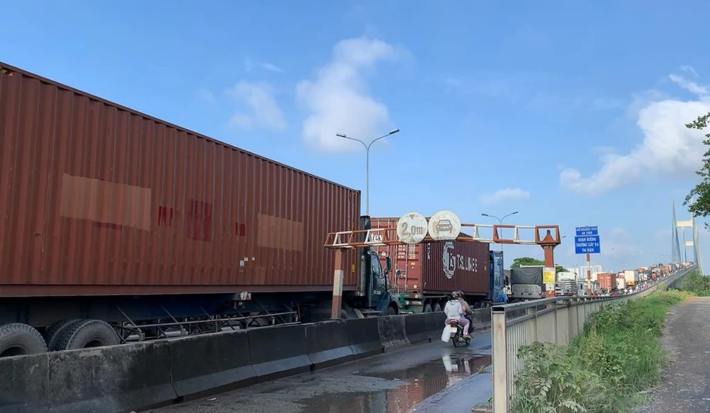 Ảnh hưởng từ vụ va chạm khiến giao thông qua cầu Phú Mỹ kẹt cứng.