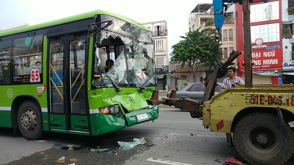 Tài xế xe tải chạy phía sau cũng giảm tốc phương tiện đột ngột khiến một xe khách chạy phía sau giảm tốc đâm trúng. Đúng lúc này xe khách biển số TP.HCM chạy tới cũng thắng gấp khiến xe buýt số 65 chạy tuyến Bến Thành- An Sương tông trúng xe khách.
