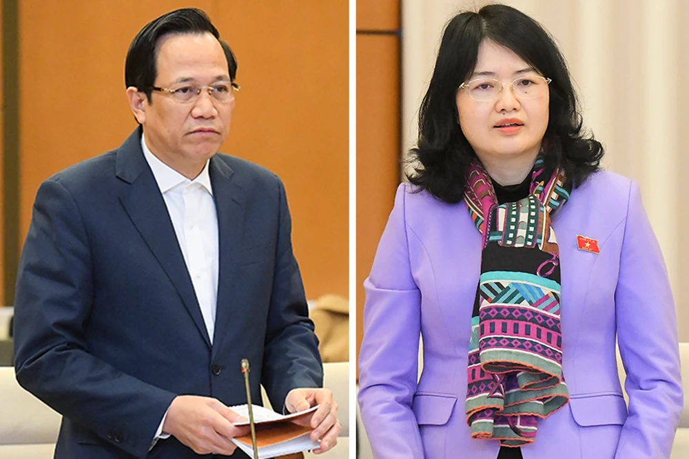 Bộ trưởng Bộ LĐ-TB&XH Đào Ngọc Dung (trái) và đại biểu Nguyễn Thị Mai Thoa tại phiên giải trình. Ảnh: Quochoi.vn