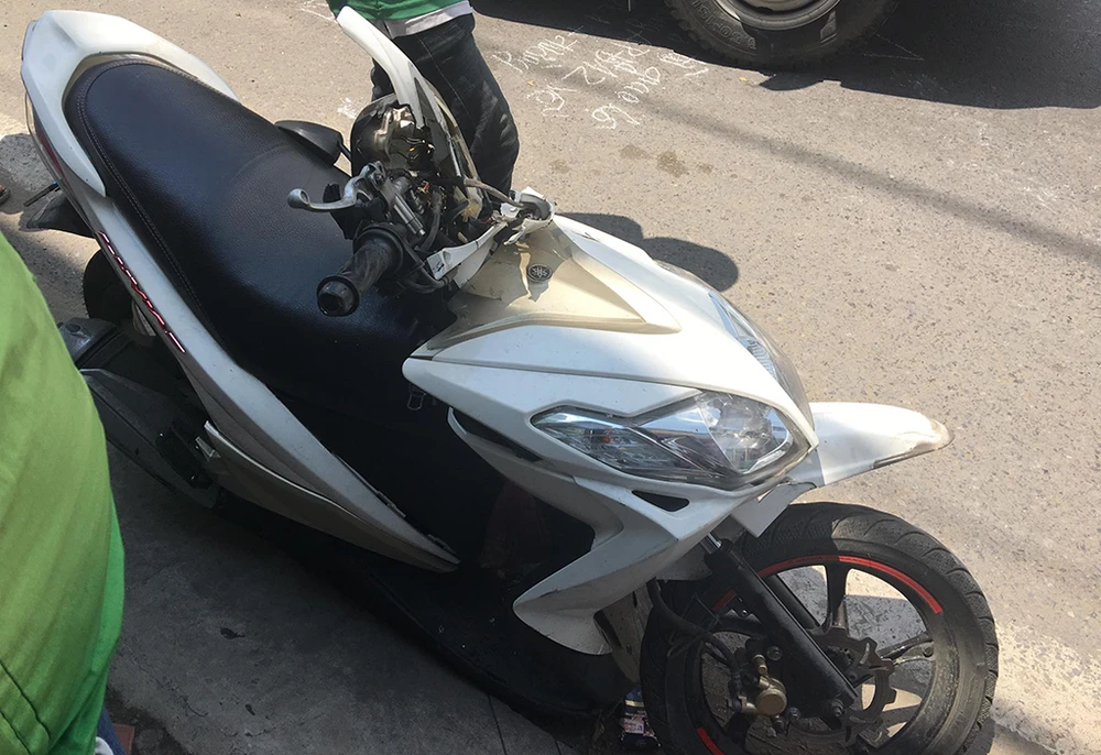 Chiếc xe máy do nam thanh niên điều khiển cũng bị hư hỏng sau tai nạn. Ảnh: HT