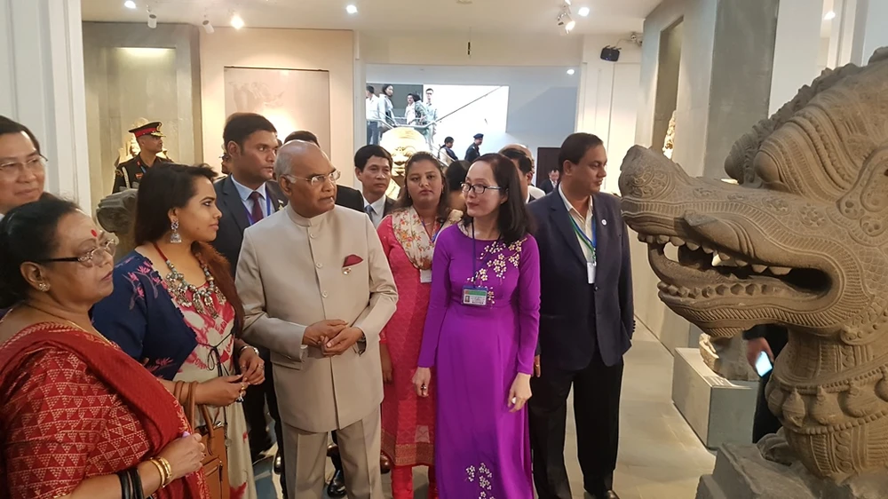 Đại diện Bảo tàng điêu khắc Chăm giới thiệu với tổng thống Ấn Độ những hiện vật được trưng bày tại bảo tàng. Ảnh: TẤN VIỆT