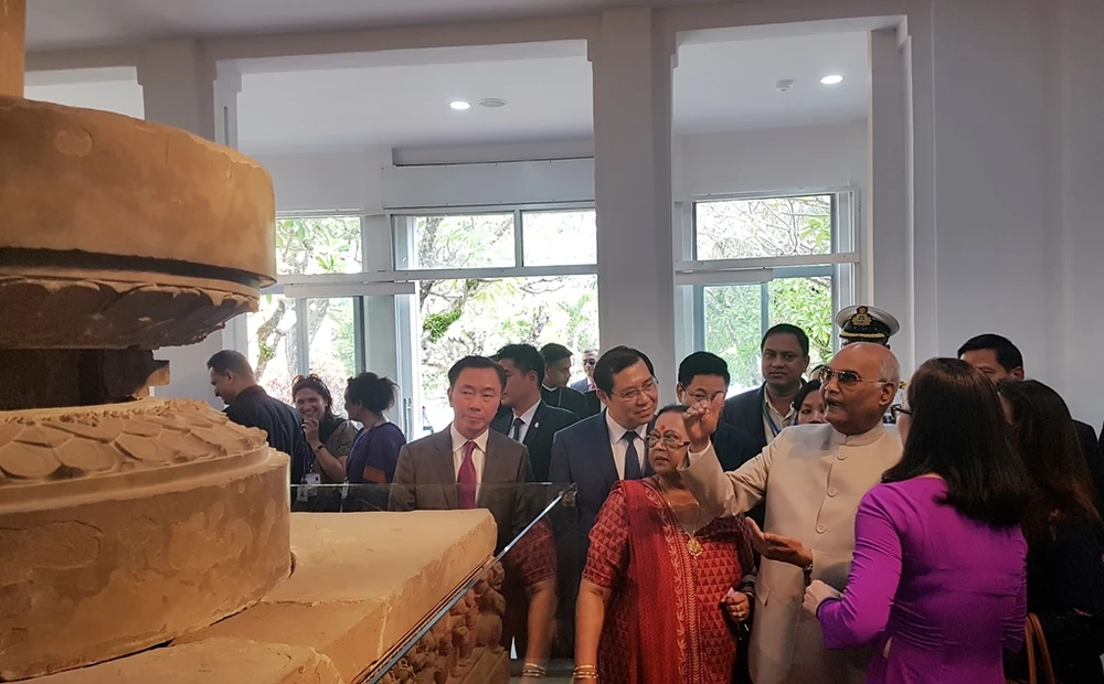 Tổng thống Ấn Độ chiêm ngưỡng các hiện vật tại Bảo tàng điêu khắc Chăm. Ảnh: TẤN VIỆT