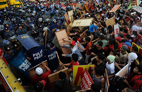 Những người biểu tình phá hàng rào cảnh sát tại Manila ngày 27-7. Ảnh: REUTERS