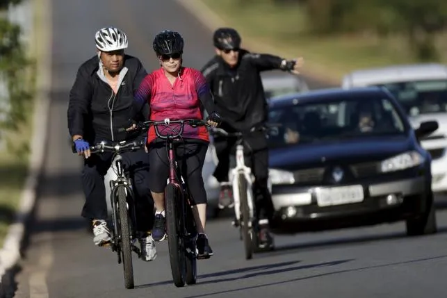 Tổng thống Dilma Rousseff (giữa) chạy xe đạp tại thủ đô Brasilia (Brazil) ngày 17-4. (Ảnh: REUTERS)