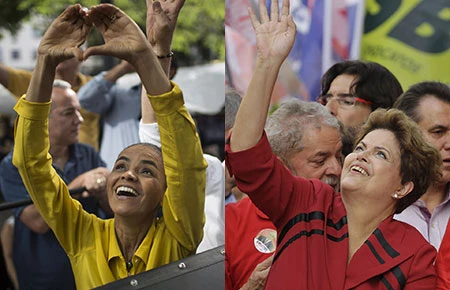 Tổng thống Dilma Rousseff (ảnh phải) là ứng cử viên sáng giá nhất có khả năng tiếp tục thực hiện nhiệm kỳ thứ hai. Tối hôm trước bầu cử, bất ngờ lần đầu tiên bà Marina Silva (ảnh trái) đã vượt trên ứng cử viên Aécio Neves để vươn lên đứng thứ nhì trong kết quả thăm dò.