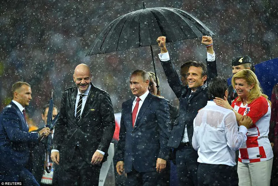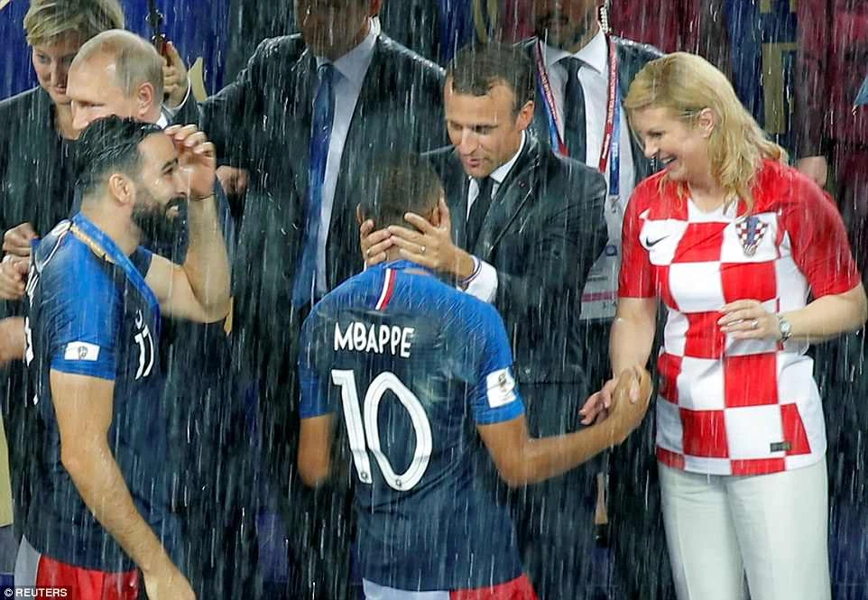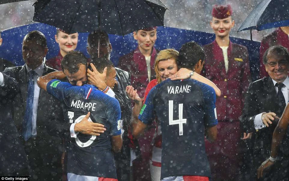 Trong lễ bế mạc, Tổng thống Pháp và Tổng thống Croatia Kolinda Grabar-Kitarovic xuống sân ôm hôn và chúc mừng các cầu thủ. Ảnh: GETTY