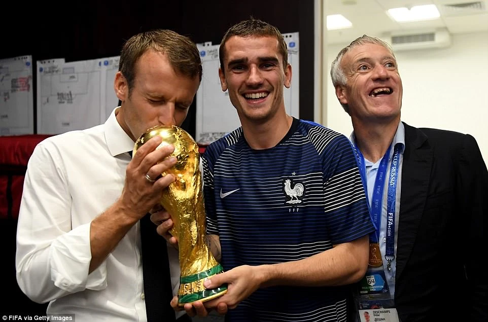 Sau khi kết thúc chương trình bế mạc, ông cùng phu nhân vào tận phòng thay đồ để tiếp tục chúc mừng các cầu thủ của mình. Tổng thống Pháp cũng không quên hôn chiếc cúp vàng để bày tỏ sự sung sướng. Ảnh: FIFA