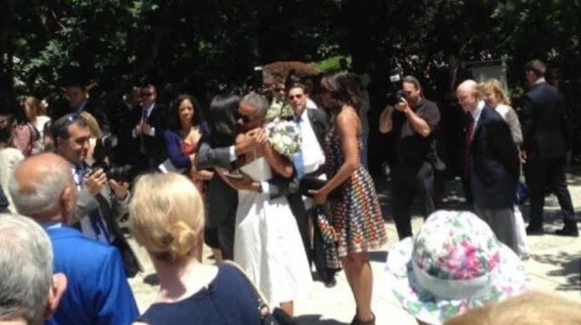 Tổng thống Obama đeo kính đen cùng đệ nhất phu nhân Michelle Obama và con gái thứ hai Sasha Obama đến trường trung học phổ thông Sidwell Friends (thủ đô Washington). Cùng với gia đình và bạn bè của các học sinh tốt nghiệp khác của Trường Sidwell Friends, vợ chồng ông chủ Nhà Trắng cũng ngồi chung hàng ghế với mọi người.