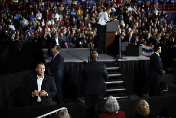 Nhân viên mật vụ bao quanh sân khấu khiTổng thống Obama phát biểu trong một cuộc mít tinh tại trường trung học Mentor ở Mentor, Ohio, 03 Tháng 11 2012.