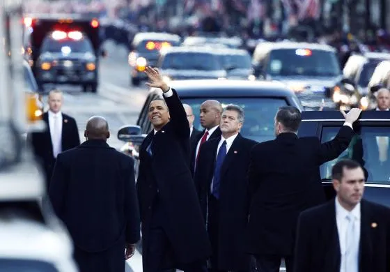Được bao quanh bởi các mật vụ, Tổng thống Obama vẫy tay chào mọi người trước khi trở lại chiếc limo của mình sau khi đi bộ trong một cuộc diễu hành nhậm chức tại Washington, ngày 21 tháng một năm 2013.