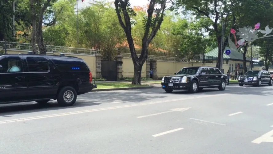Đoàn xe gồm hai chiếc Cadilac One xuất phát từ Lãnh sự quán Mỹ di chuyển đến sân bay để đón Tổng thống Obama. Ảnh: Hoàng Tuyết