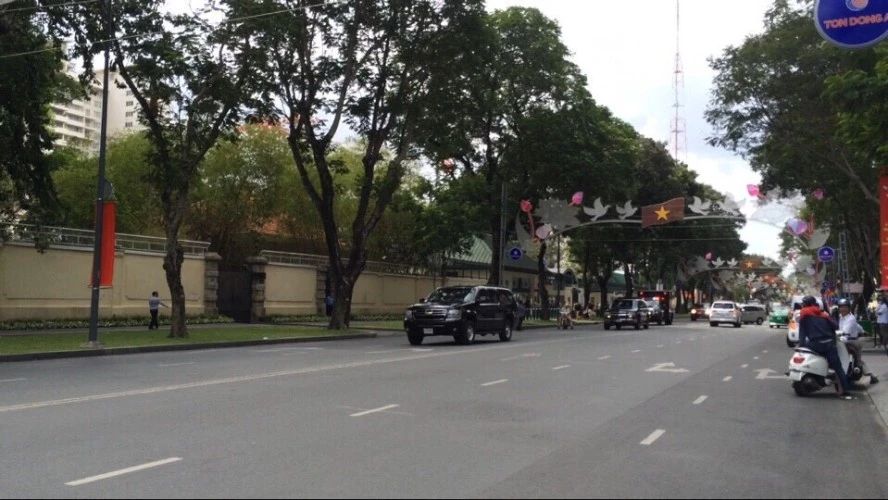 Đoàn xe ông Obama về khách sạn từ đường Nguyễn Du (Q1). Ảnh: Lê Thoa