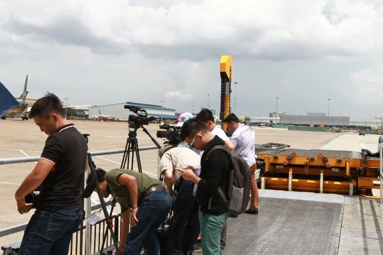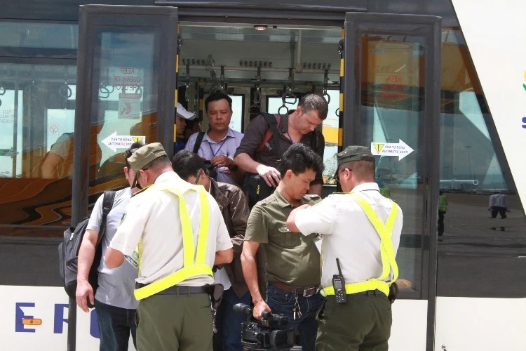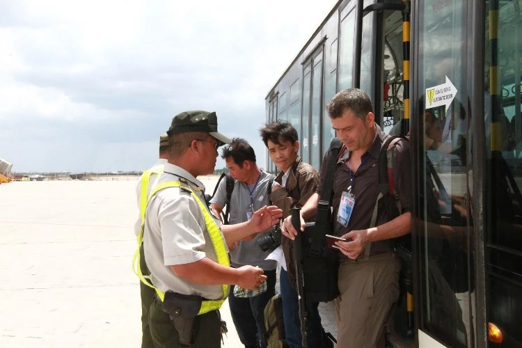 Lực lượng an ninh kiểm tra giấy tờ của các phóng viên, báo đài trước khi cho vào sân bay. Ảnh: Thanh Danh