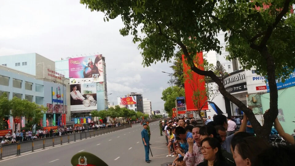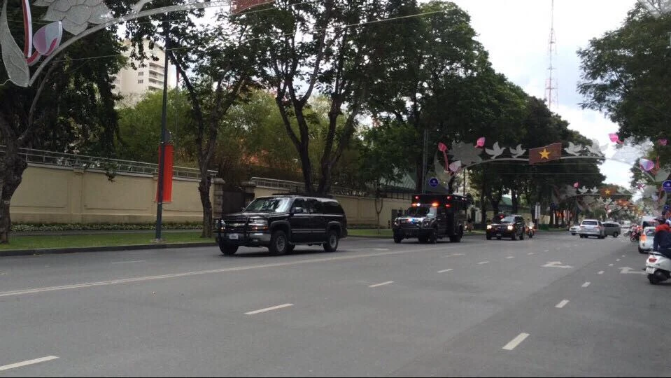 Đoàn xe đưa tổng thống Obama đã rời khỏi sân bay Tân Sơn Nhất, tiến vào đường Trường Sơn (quận Tân Bình). Có mặt trên tầng cao của một cao ốc, phóng viên Nguyễn Tân cho biết có thể nghe rõ tiếng hò reo của người dân chào đón hai bên đường.