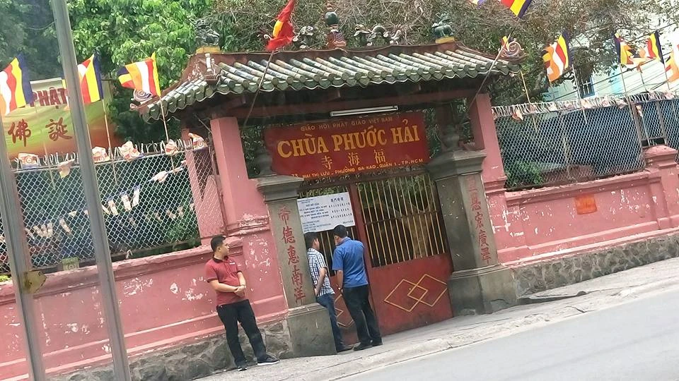 Các phóng viên được kiểm soát an ninh trước khi vào chùa. Ảnh: Hoàng Giang