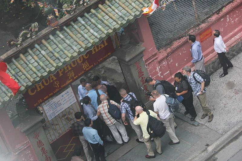 Tại khu vực chùa Ngọc Hoàng quận 1 từ 11 giờ đoạn đường bắt đầu cấm xe. Người dân sống trong khu vực về nhà phải xuất trình CMND. Lực lượng an ninh hai nước được triển khai bên ngoài và trong chùa Ngọc Hoàng. Chó nghiệp vụ cũng được đưa vào chùa làm nhiệm vụ. Ảnh: Hoàng Giang