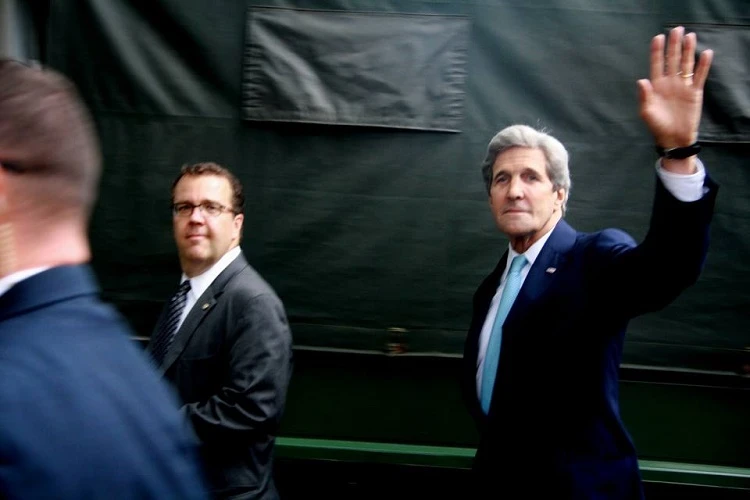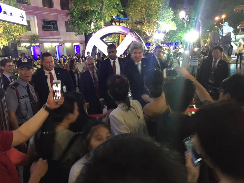 Ông John Kerry, Bộ trưởng Bộ ngoại giao Mỹ đi bộ cùng đoàn tùy tùng khu vực Nguyễn Trung Ngạn để chuẩn bị tiếp Tổng thống Obama.