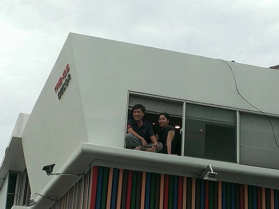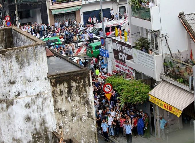 Đôi vợ chồng trẻ chọn cách đón xem đoan xe bằng cách leo lên tầng 1 của căn nhà trên đường Nguyễn Văn Trỗi. Ảnh: Huyền Vi