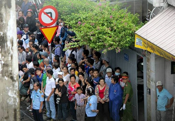 Bà Nguyễn Thị Hoa, nhà ở Phú Nhuận cùng hai con ra góc đường Nguyễn Văn Trỗi để chờ đoàn xe đi qua. Ảnh: Huyền Vi