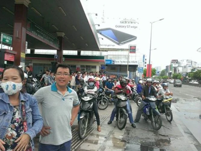 Cây xăng tại đầu đường Nguyễn Văn Trỗi đã chật kín người . Ảnh: Huyền Vi
