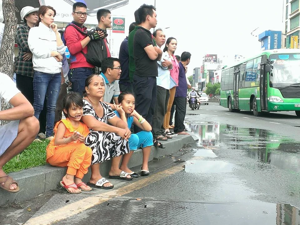 13 giờ 30 trời Sài Gòn bắt đầu đổ mưa to. Người dân từ các nơi đổ về xem Tổng thống Obama dầm mưa chờ đợi ở đường Mai Thị Lựu giao Điện Biên Phủ. Ảnh: Hoàng Giang