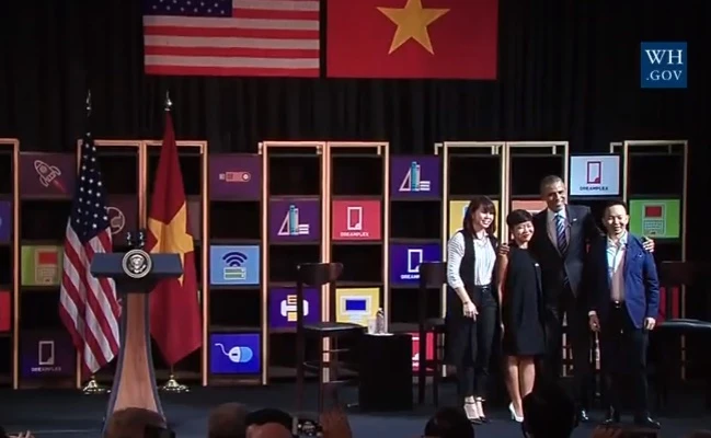 Tổng thống Mỹ Barack Obama đã có mặt tại lầu 14 của Dreamplex, nơi gần 100 đại diện startup Việt đang chờ đợi cuộc giao lưu với người đứng đầu Nhà Trắng. Ông bước vào khán phòng trong những tiếng vỗ tay nhiệt tình của các doanh nghiệp trẻ.