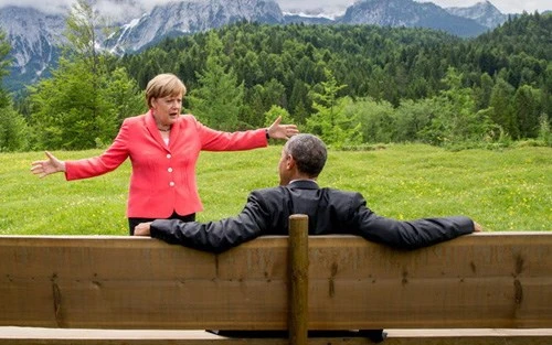 Ông Obama (ngồi) và thủ tướng Đức Angela Merkel (đứng) tại hội nghị G7
