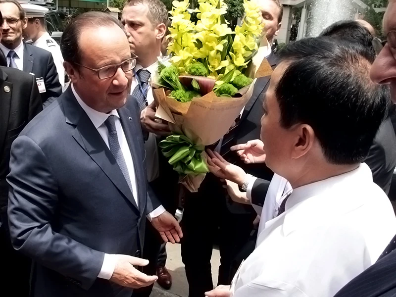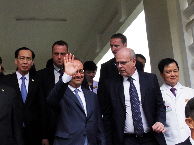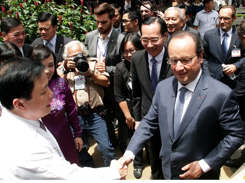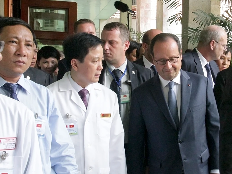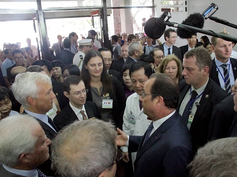 Sáng 7-9, sau khi đến thăm Công ty Linkbynet ở đường Điện Biên Phủ, gặp gỡ một số doanh nhân, Tổng thống Hollande đã đến thăm Viện Tim TP.HCM - biểu tượng của hợp tác Việt-Pháp về y tế.