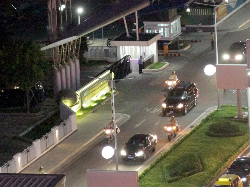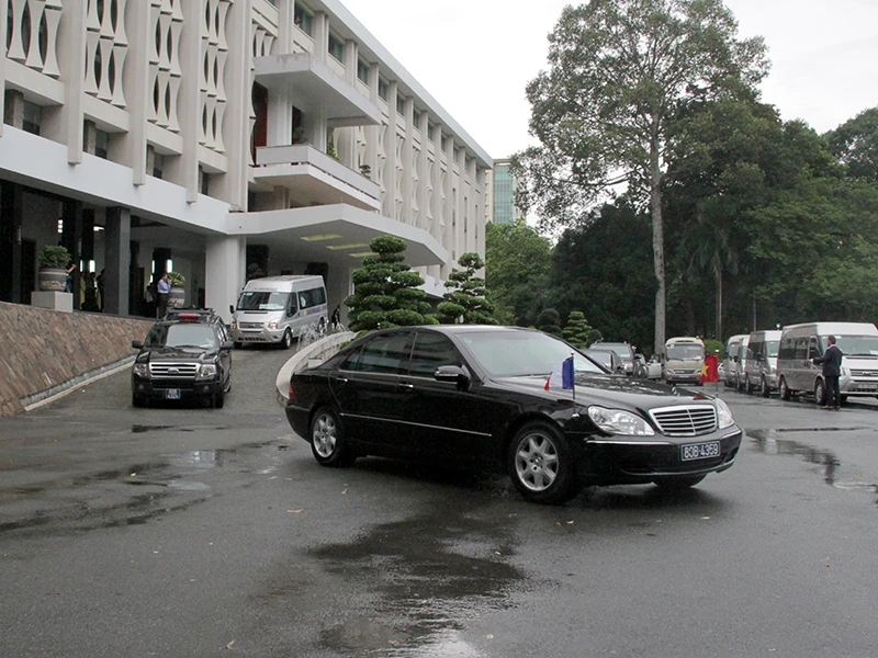 Đoàn xe hộ tống Tổng thống Hollande rời khỏi sân bay Tân Sơn Nhất vào khoảng 19 giờ 20 tối 6-9 bắt đầu chuyến thăm và làm việc khá bận rộn tại TP.HCM.