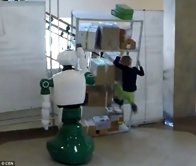 Video quay lại cảnh Promobot đã đưa tay giữ lấy kệ sách để nó không đổ sập vào cô bé. Ảnh: CEN