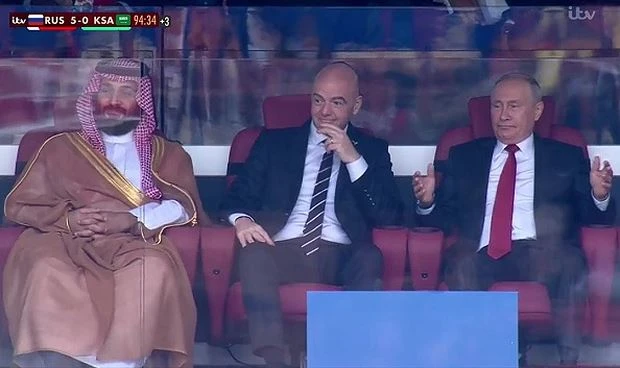 Còn nhớ ở trận khai mạc, Tổng thống Nga Putin ngồi cạnh bên trái cùng Chủ tịch FIFA G. Infantino, còn bên phải là Hoàng tử Saudi Arabia. Cứ mỗi bàn thắng của Nga thì người đứng đầu nước Nga vỗ tay rồi quay sang bắt ông Hoàng Saudi… vài lần nhưng lần thứ ba, tư… năm thì không có nữa. Lúc đó Chủ tịch FIFA Infantino cũng rất khó xử nên chỉ… cười cười và không bắt tay ai cả.