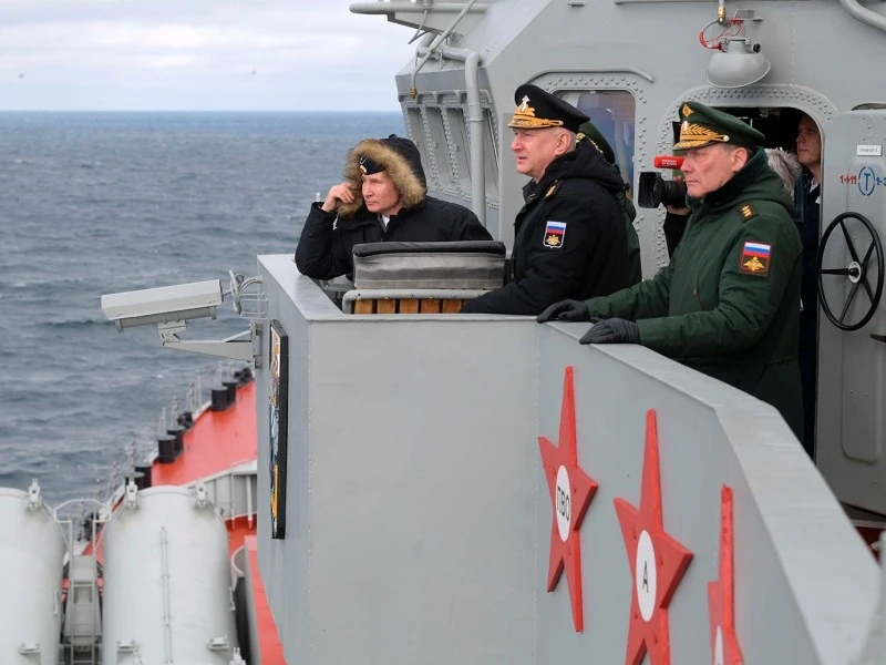 Tổng thống - Tổng Tư lệnh các lực lượng vũ trang Nga Vladimir Putin đã có mặt trên tàu tuần dương nguyên soái Ustinov để tham gia thị sát cuộc diễn tập.