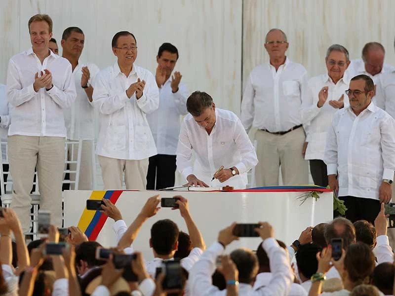 Đến ngày 26-9, hai ông chính thức ký kết hiệp định hòa bình tại Cartagena. Đây là thành quả đạt được sau gần bốn năm ròng đàm phán do Cuba và Na Uy bảo trợ nhằm kết thúc một cuộc xung đột lâu đời nhất và lớn nhất ở Colombia.