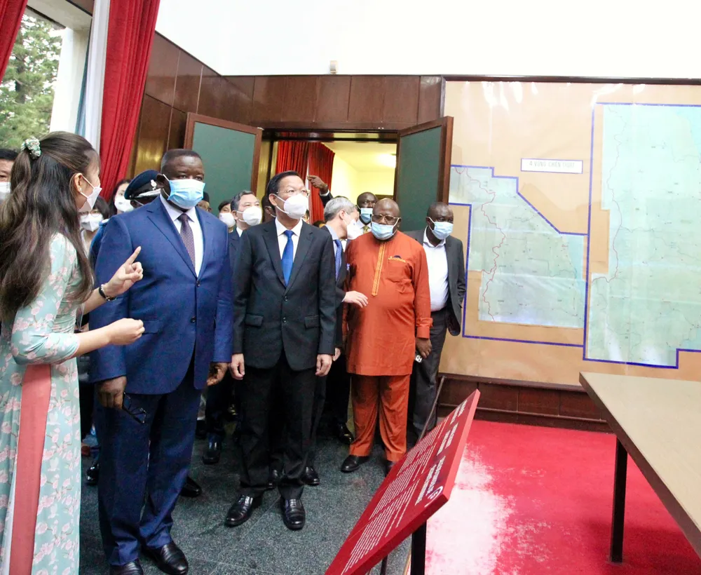 Chủ tịch UBND TP.HCM Phan Văn Mãi cùng Tổng thống Sierra Leone tham quan tại hội trường Thống Nhất. Ảnh: NGUYỆT NHI