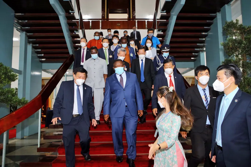 Toàn cảnh buổi đón tiếp ông Julius Maada Bio, Tổng thống nước Cộng hoà Sierra Leone tại hội trường Thống Nhất. Ảnh: NGUYỆT NHI