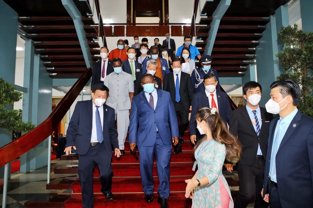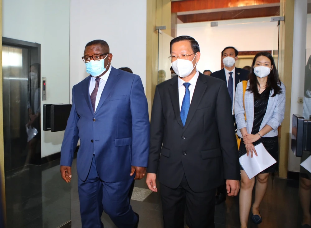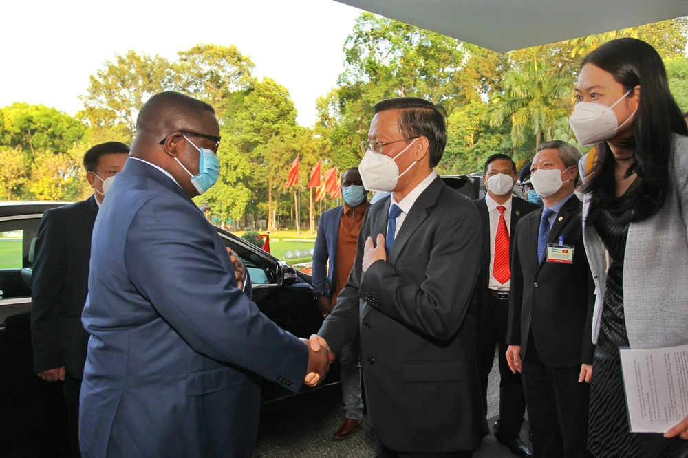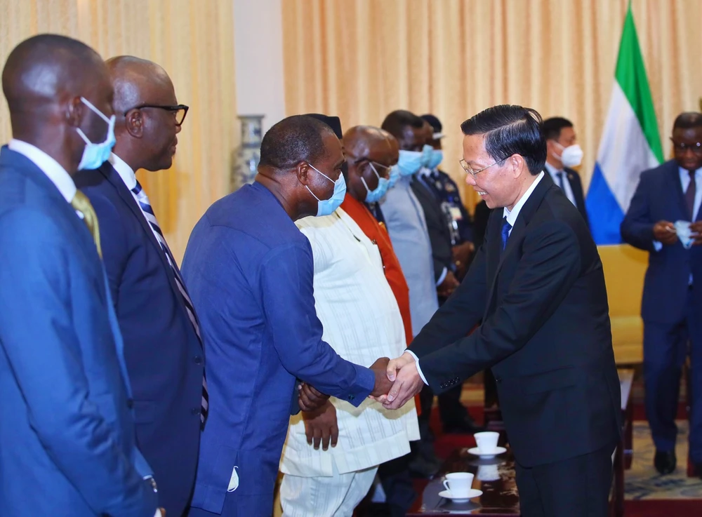 Chủ tịch UBND TP.HCM Phan Văn Mãi thăm hỏi đoàn đại biểu Sierra Leone. Ảnh: NGUYỆT NHI