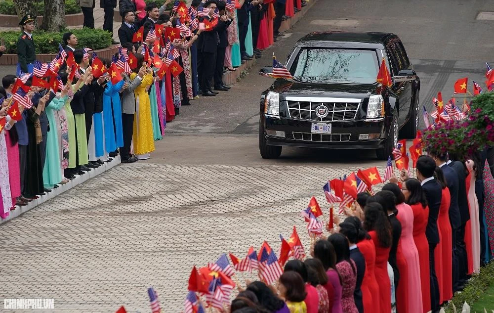 Đoàn xe chở Tổng thống Hoa Kỳ trên đường tiến vào Trụ sở Chính phủ trong sự chào đón của đông đảo cán bộ Văn phòng Chính phủ. Ảnh: Chinhphu.vn