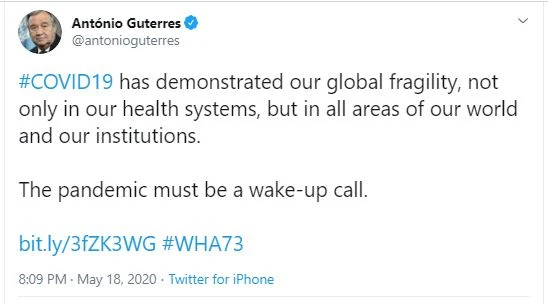 Ngày 18-5, trong bài phát biểu khai mạc Hội nghị Y tế Thế giới (WHA) lần thứ 73, Tổng thư ký Liên Hợp Quốc Antonio Guterres nhấn mạnh đại dịch COVID-19 là "lời kêu gọi thức tỉnh" để thế giới phải đoàn kết hơn trong cuộc chiến này, theo hãng tin AFP.
