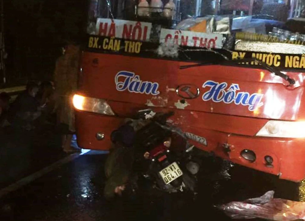 Khi đang vượt, mẹ con chị Giang bị xe khách chạy hướng ngược lại tông trực diện khiến tử vong tại chỗ. Xe máy mắc kẹt dưới gầm ô tô khách.