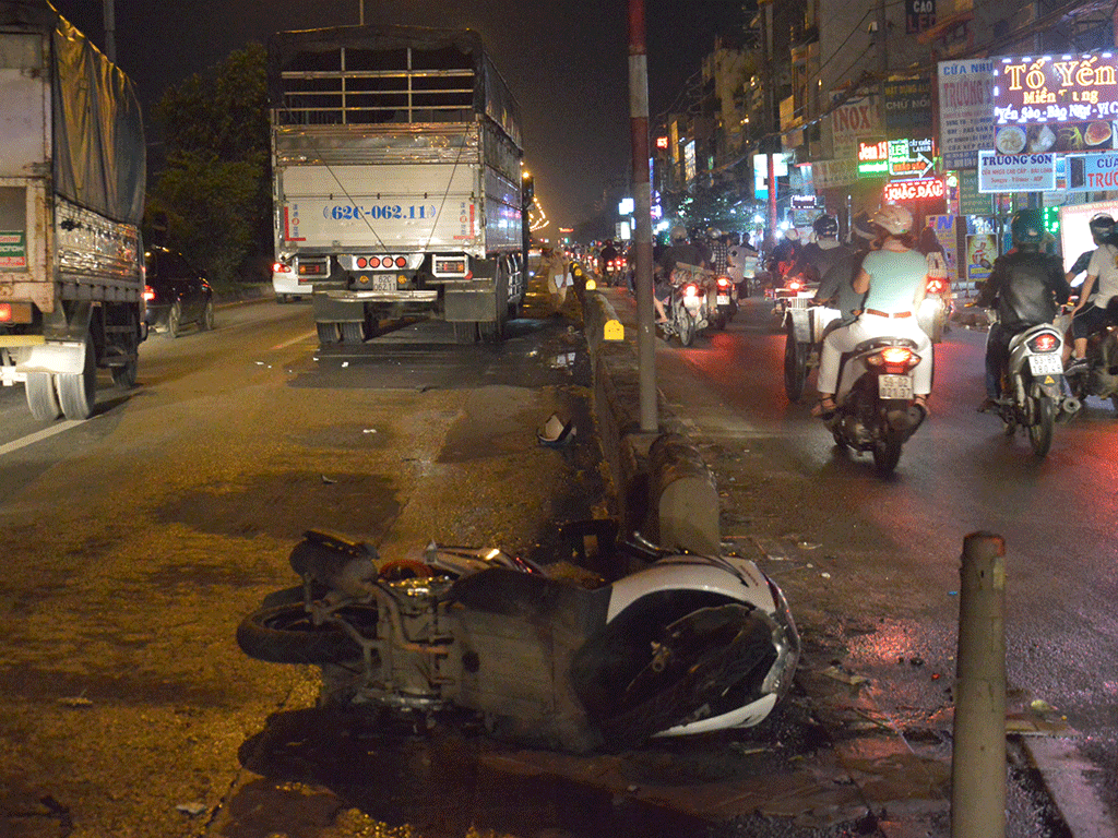 Tại hiện trường, chiếc xe máy nằm ngay điểm đầu dải phân cách cứng giữa làn ô tô và hai bánh, chiếc mũ bảo hiểm vỡ nát văng trên đường, xe tải dừng cách đó không xa. Lực lượng CSGT cùng các đơn vị nghiệp vụ sở tại nhanh chóng có mặt khám nghiệm hiện trường.