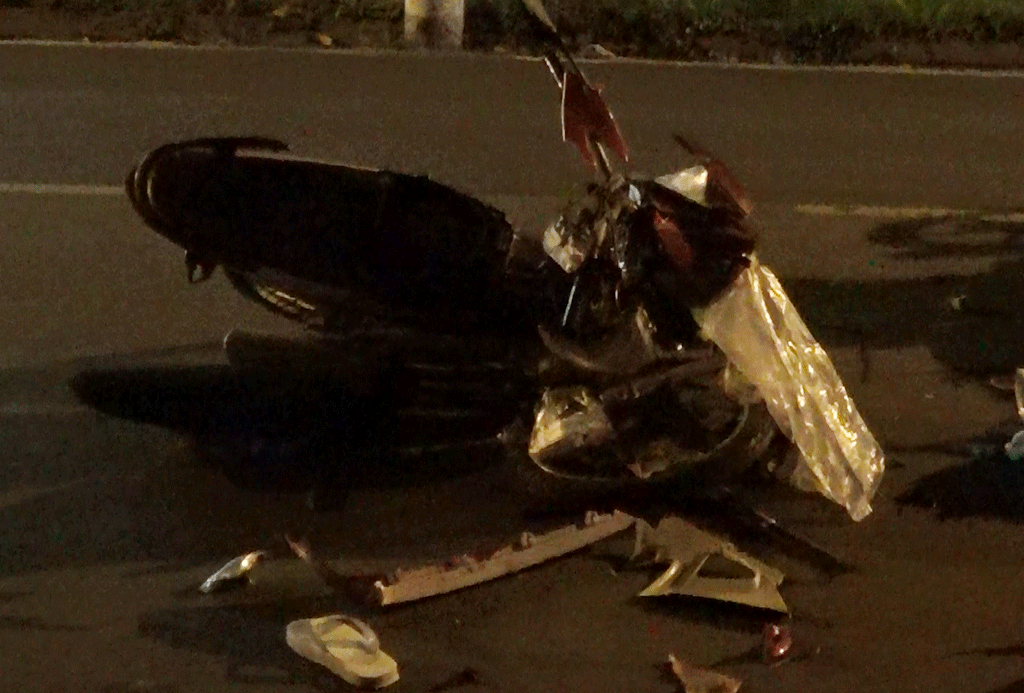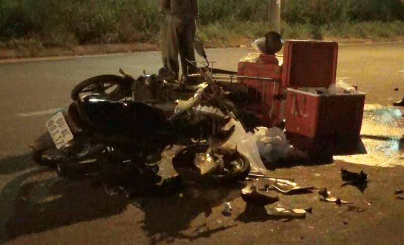 Tại hiện trường, xe máy của nữ công nhân bị hư hỏng nặng, gãy làm đôi. Phần đầu, thân xe bị bể nát hoàn toàn. Thùng chở cá đổ ra đường.
