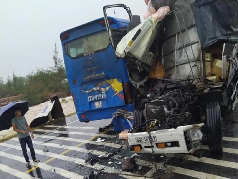 Theo đó, khoảng 6 giờ 45, ô tô khách 17B-012.10 chạy hướng Bắc-Nam, khi đến địa điểm trên đã va chạm với xe tải 89C-102.57 lưu thông cùng chiều. Ô tô này cũng va chạm với xe đầu 60C-477.46 đi từ hướng ngược lại.