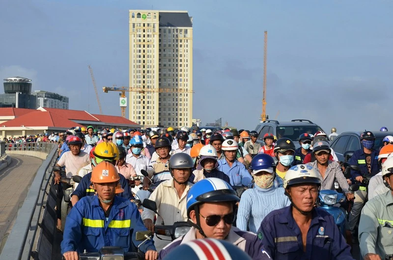 Do cả ba phương tiện mắc kẹt ở một làn đường trên cầu Khánh Hội khiến giao thông khu vực ùn ứ nghiêm trọng. Hàng ngàn phương tiện kéo dài khoảng 1 km khó nhọc nhích từng chút một.